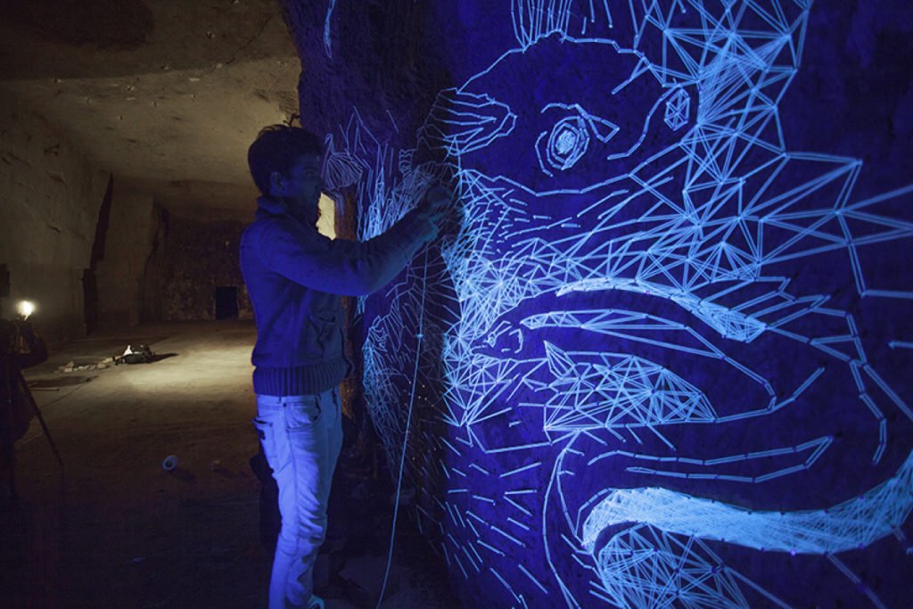 This creation is made out of nails and white threads, the images of which come to life thanks to the lighting. Evoking cave art, Julien Salaud’s work is powerful and poetic. For several years now, Julien Salaud has successfully used this technique inspired by cave art. As he points out, “Today, many ancient artisan techniques have been updated thanks to contemporary art: ceramics, needle work, cave art, metallurgy… We are returning to our roots, going back to the basics.” As a result, he has adapted his cave art to the immensity of the location. Indeed, this embroidery required around 17,000 nails and 20 kilometers of cotton thread. It took 2 and a half weeks to make with the help of 6 permanent volunteers and up to 13 people on some days.